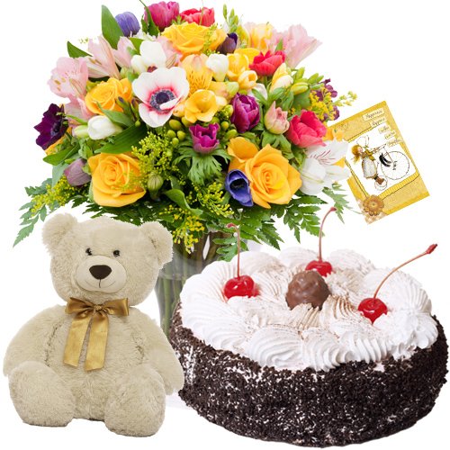 A Best Confer- Bounch Assorted Flowers + Teddy 8" + 1/2 Kg Black Forest Cake + Card |
