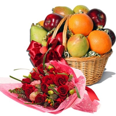 6 items Fresh Fruit Basket w/ 12 red rosessame like pic​N0TE: FRUITS ITEMS MAY VARY ..DEPEND ON TH AVAILABILITY |