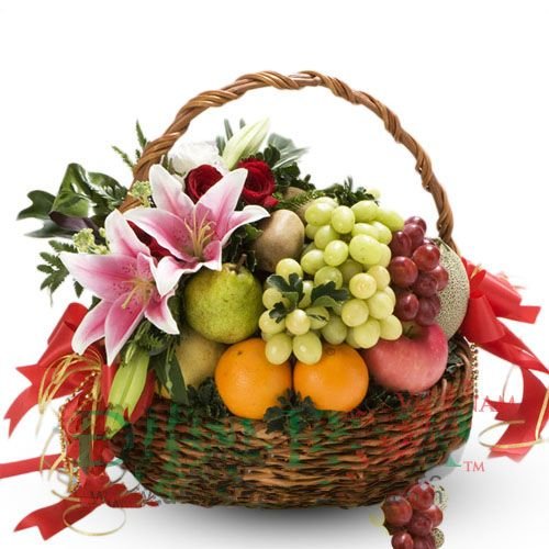 Basket of fruit for MOMOranges, apples and bananas complete this basket of flowers with the juicy, citrus sweetness they bring out. Fruits Arrangement (6 item) and stargaizer,gerbera in a basket. |